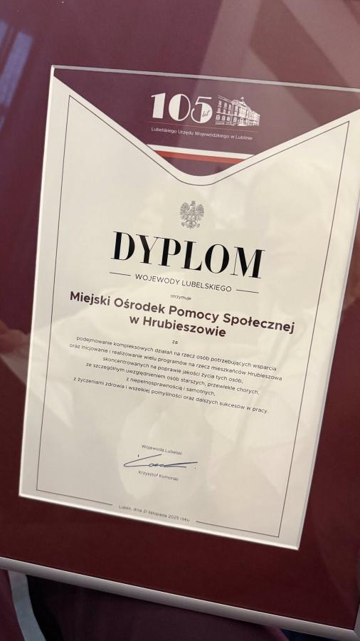 21 listopada, podczas wojewódzkich obchodów Dnia Pracownika Socjalnego w Lubelskim Urzędzie Wojewódzkim, kadra Miejskiego Ośrodka Pomocy Społecznej w Hrubieszowie została wyróżniona przez Wojewodę Lubelskiego, Krzysztofa Komorskiego. To wyjątkowe docenienie codziennej pracy wykonywanej na rzecz mieszkańców Hrubieszowa – pracy pełnej zaangażowania, empatii i profesjonalizmu. W kategorii indywidualnej wyróżnienie otrzymała Pani Jolanta Laskowska, Zastępca Kierownika MOPS Hrubieszów. Jest to szczególne uhonorowanie jej wieloletniej, odpowiedzialnej i pełnej oddania pracy na rzecz osób potrzebujących. Serdecznie gratulujemy tego zasłużonego wyróżnienia.