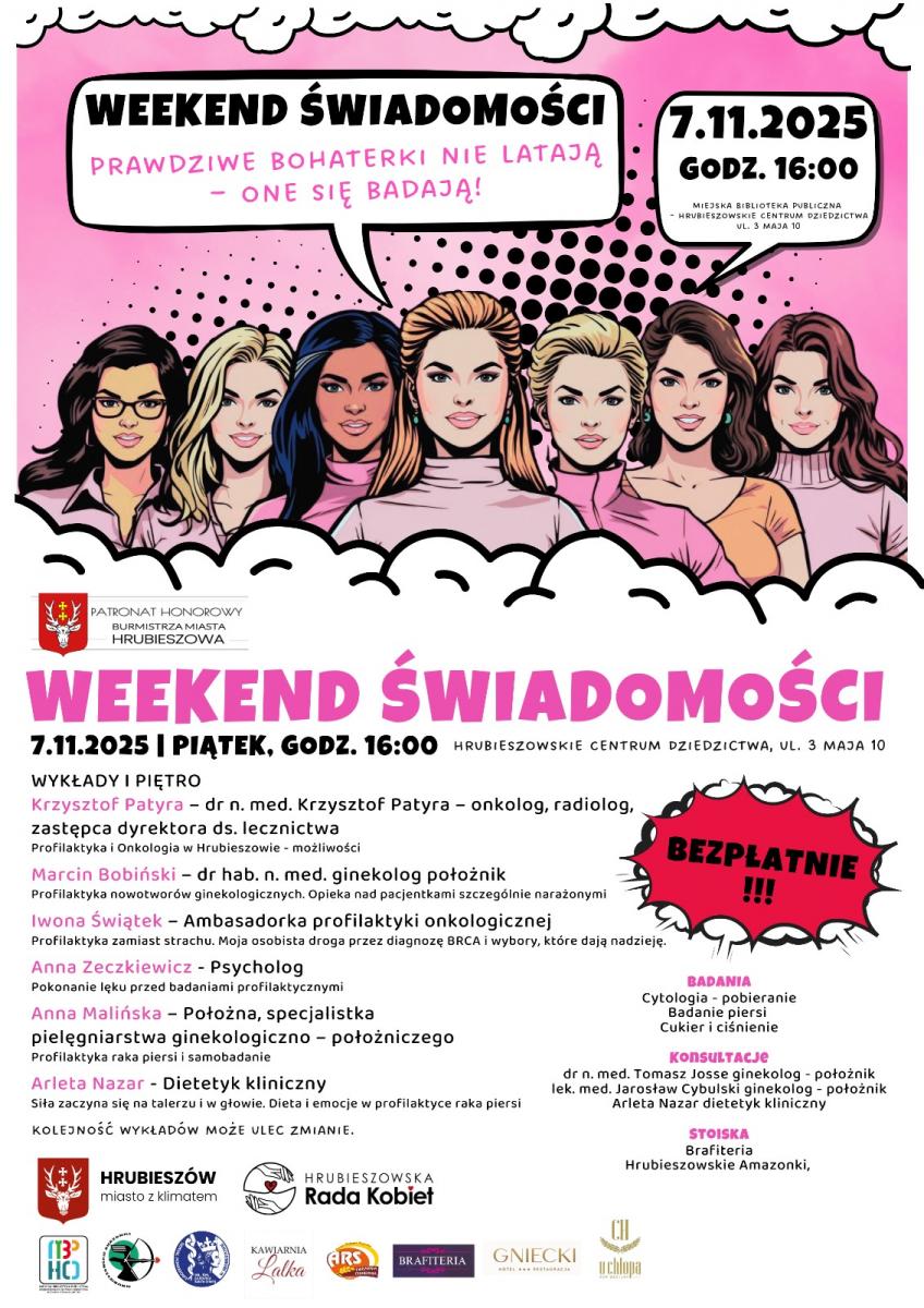 Miasto Hrubieszów oraz Hrubieszowska Rada Kobiet zapraszają na wydarzenie poświęcone profilaktyce zdrowotnej – Weekend Świadomości „Prawdziwe bohaterki nie latają – one się badają!”. Spotkanie ma na celu zwiększenie świadomości dotyczącej znaczenia badań profilaktycznych, zdrowego stylu życia i wczesnego wykrywania nowotworów u kobiet. 7 listopada 2025 r. (piątek), godz. 16:00. Miejska Biblioteka Publiczna – Hrubieszowskie Centrum Dziedzictwa, ul. 3 Maja 10