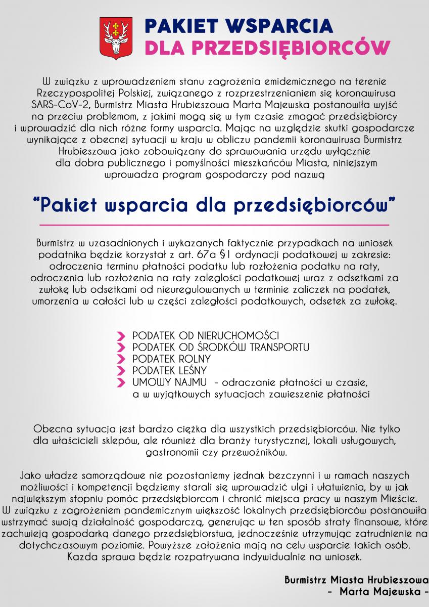 W związku z wprowadzeniem stanu zagrożenia emidemicznego na terenie Rzeczypospolitej Polskiej, związanego z rozprzestrzenianiem się koronawirusa SARS-CoV-2, Burmistrz Miasta Hrubieszowa Marta Majewska postanowiła wyjść na przeciw problemom, z jakimi mogą się w tym czasie zmagać przedsiębiorcy i wprowadzić dla nich różne formy wsparcia. Mając na względzie skutki gospodarcze wynikające z obecnej sytuacji w kraju w obliczu pandemii koronawirusa Burmistrz Hrubieszowa jako zobowiązany do sprawowania urzędu wyłącznie dla dobra publicznego i pomyślności mieszkańców Miasta, niniejszym wprowadza program gospodarczy pod nazwą “Pakiet wsparcia dla przedsiębiorców”.