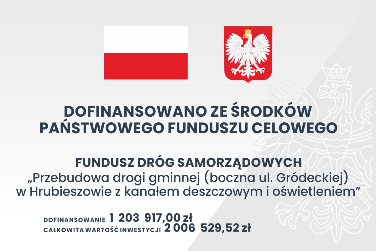 Gmina miejska zrealizowała zadanie pn. "Przebudowa drogi gminnej (boczna ul. Gródeckiej) w Hrubieszowie z kanałem deszczowym i oświetleniem" dofinansowane ze środków Państwowego Funduszu Celowego w ramach Funduszu Dróg Samorządowych.